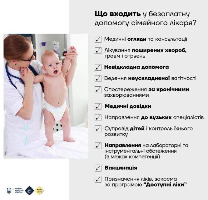 Що саме входить у безоплатну допомогу сімейного лікаря дивіться у інфографіці: