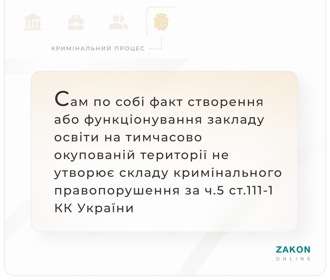 ВС виснував, що сам по собі факт створення або функціонування закладу освіти на тимчасово окупованій території, а також виконання його керівником організаційно-розпорядчих та адміністративно-господарських функцій у межах діяльності такого закладу, за відсутності ознак органу влади, не утворює складу кримінального правопорушення, передбаченого ч.5 ст.111-1 КК України.