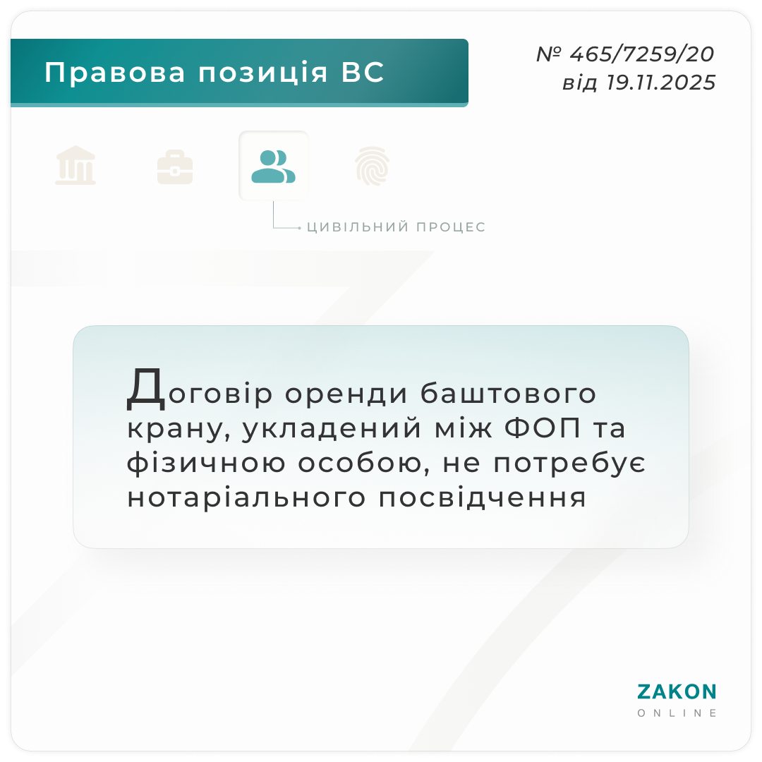 ФОП як орендодавець за договором оренди баштового крану звернувся до суду з позовом про стягнення з орендаря заборгованості за цим договором. Суд першої інстанції задовольнив позов. Натомість апеляційний суд відмовив у задоволенні позову, оскільки вважав що вказаний договір є договором оренди транспортного засобу, у зв`язку з чим такий договір підлягав нотаріальному посвідченню згідно з ч.2 ст.799 ЦК України, оскільки контрагентом є відповідач як фізична особа.