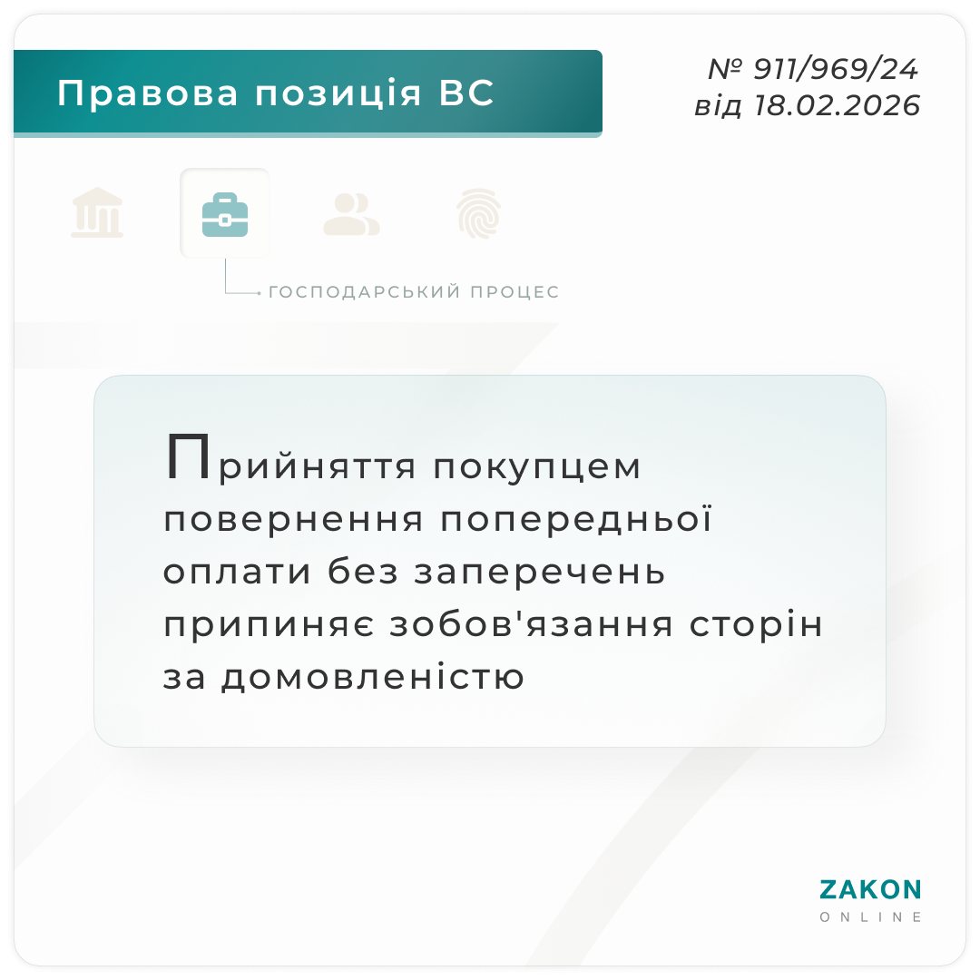 ВП ВС відповідаючи на питання вказала, що положення ч. 2 ст. 693 ЦК України, яке передбачає право покупця «вимагати передання оплаченого товару або повернення суми попередньої оплати», якщо продавець, який одержав суму попередньої оплати товару, не передав товар у встановлений строк, неявно включає і право покупця прийняти повернення суми попередньої оплати, здійснене за ініціативою продавця (погодитися на пропозицію продавця щодо такого повернення) або заперечити проти цього і вимагати від продавця передачі товару.