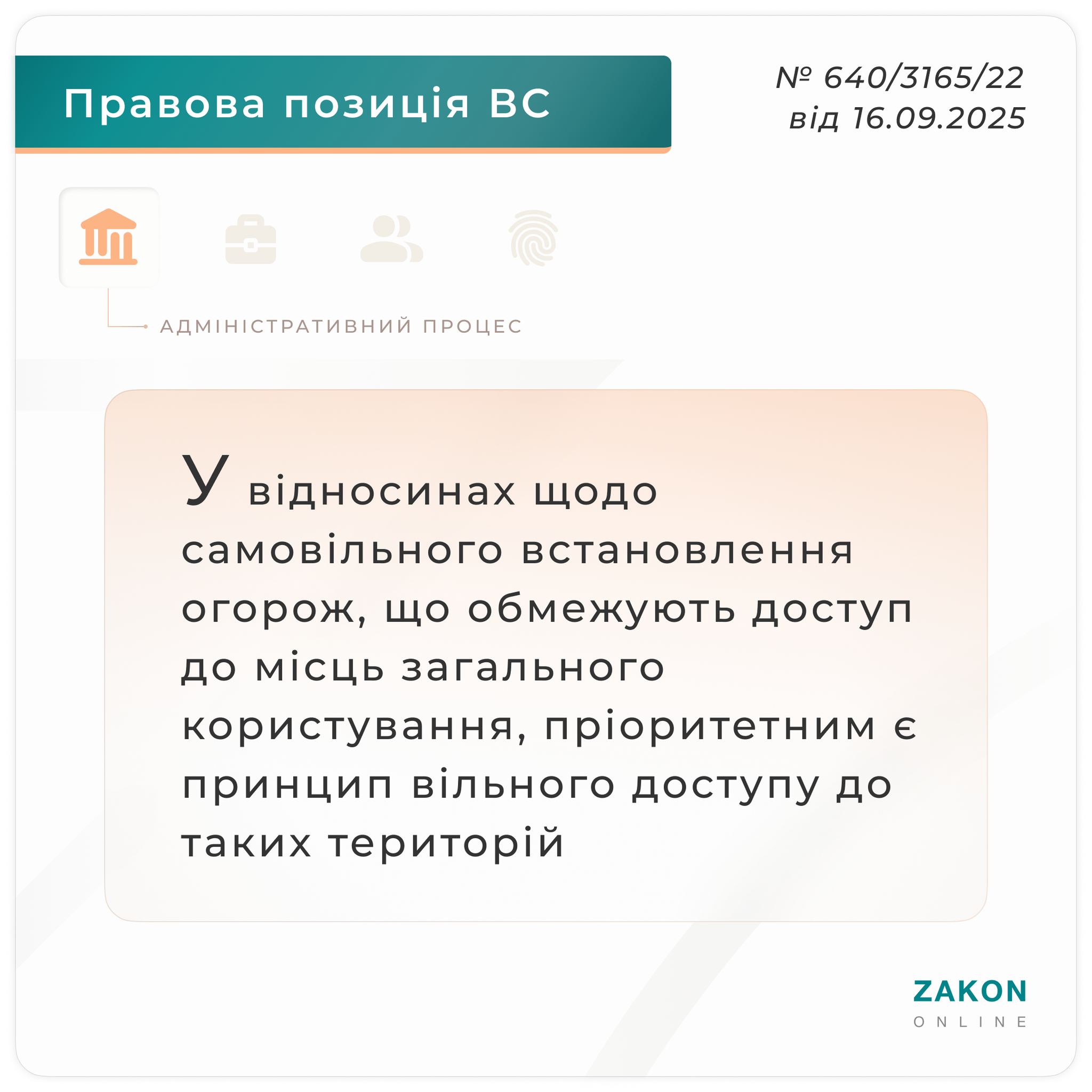 У правовідносинах, пов'язаних із самовільним встановленням огорож, воріт та інших елементів благоустрою, що обмежують доступ до вулиць, доріг, набережних чи інших територій загального користування, пріоритетним є дотримання принципу відкритого і вільного доступу громадян до таких об'єктів. Обмеження доступу на землях комунальної або державної власності суперечить ст.ст. 13 та 19 Конституції України, порушує права окремих осіб і суспільні інтереси, а також створює ризик формування практики системних порушень з боку приватних осіб, забудовників та об'єднань громадян.
