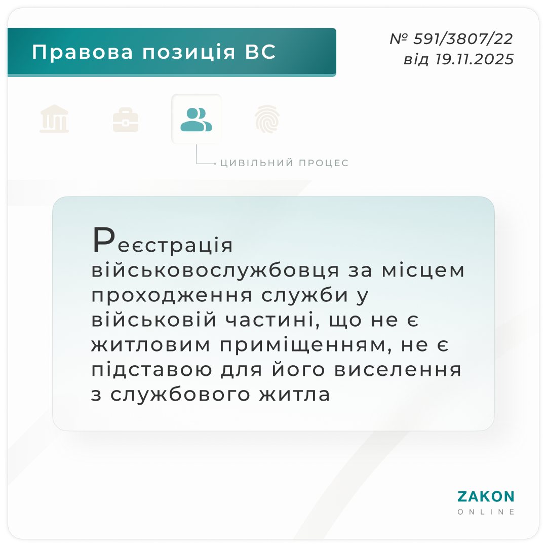 З огляду на це, ВС наголосив, що саме собою вибуття до іншого місця служби та реєстрація військовослужбовця за місцем проходження служби за адресою військової частини, що не є гуртожитком чи іншим житловим приміщенням, не є підставою для його виселення із службового житла за відсутності доказів наявності іншого постійного або службового житла.