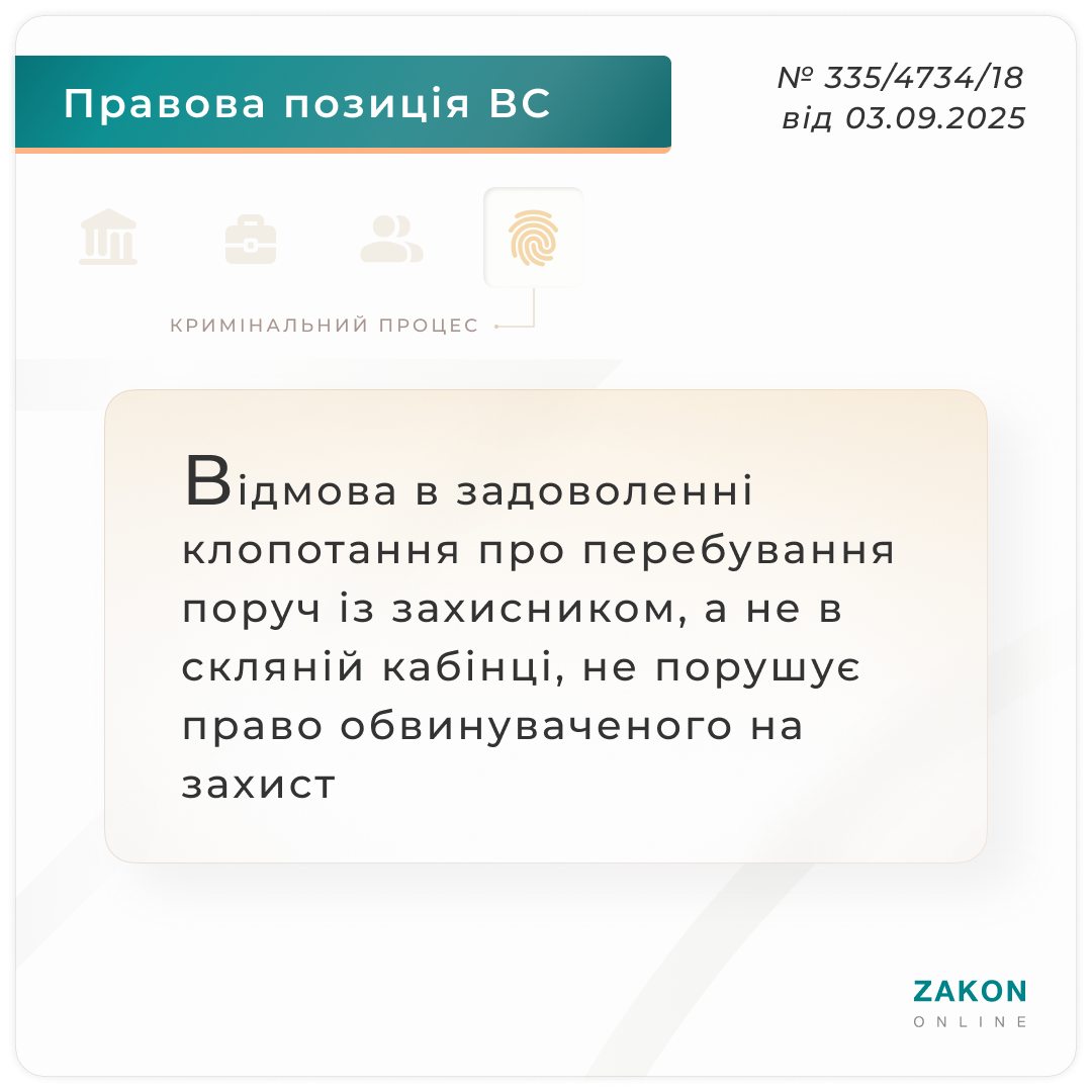 У даній справі предметом перевірки були твердження засудженого про порушення його права на захист внаслідок відмови суду в задоволенні клопотання про перебування поруч із захисником, а не в скляній кабінці.