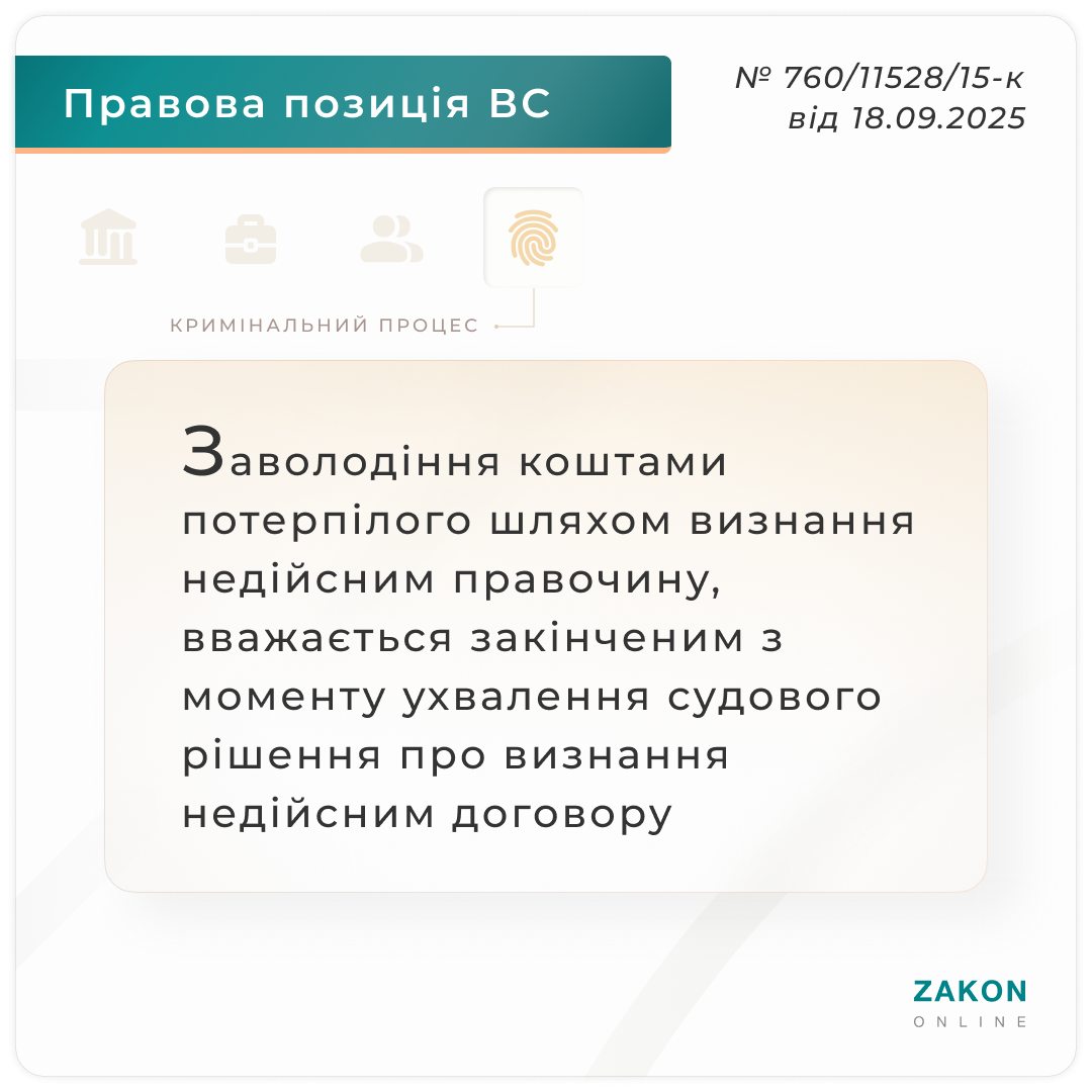 Лише коли новий власник квартир їх позбавляється на підставі рішення суду - злочин варто вважати закінченим. До цього моменту не можна сказати, що суб'єкт кримінального правопорушення заволодів коштами, він лише отримав їx за договором, який з юридичної точки зору був на перший погляд законним, поки районний суд не визнав цей правочин недійсним. Саме на такий розвиток шахрайський дій розраховували обвинувачений та інші учасники. Гроші, що вже у них знаходилися за зовні правомірними підставами, набули ознак протиправного (злочинного) доходу.