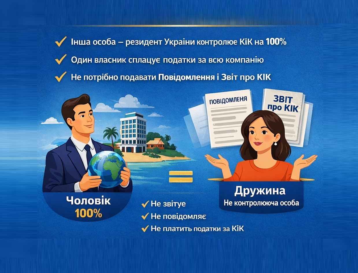 - інша фізична особа – резидент України офіційно визнає себе контролюючою особою у розмірі 100%, і саме на цю особу покладається обов’язок оподаткування прибутку КІК у повному обсязі.