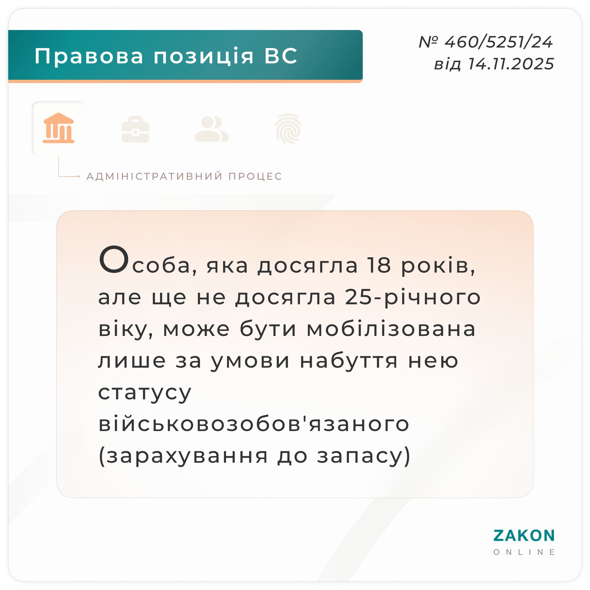 ВС виснував, що особа, яка досягла 18 років, але ще не досягла 25-річного віку, може бути мобілізована лише за умови набуття нею статусу військовозобов'язаного (зарахування до запасу). Мобілізаційні заходи стосуються виключно військовозобов'язаних та резервістів, а не призовників.