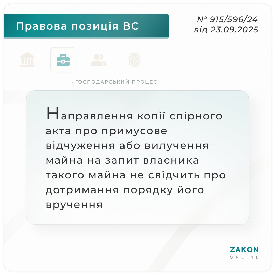 З огляду на наведене вище ВС виснував, що направлення копії спірного акта про примусове відчуження або вилучення майна на запит позивача не свідчить про дотримання порядку його вручення, встановленого ч.5 ст.7 Закону України "Про передачу, примусове відчуження або вилучення майна в умовах правового режиму воєнного чи надзвичайного стану".