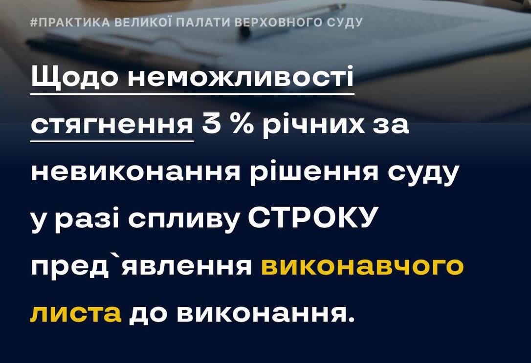 ВПВС з урахуванням власних висновків у цій справі вважає, що суди попередніх інстанції, відмовляючи в задоволенні позовних вимог про стягнення 3 % річних за невиконання рішення суду про стягнення кредитної заборгованості, правильно виходили з того, що у зв`язку зі спливом строку, наданого законом для пред`явлення виконавчого листа до виконання, відмовою судуу поновленні цього строку і у видачі дубліката виконавчого листа, немає і обов`язку відповідача у грошовому зобов`язанні, який би міг бути виконаний примусово, а отже, немає правової підстави для стягнення можливого похідного зобов`язання, передбаченого ст. 625 ЦК України.
