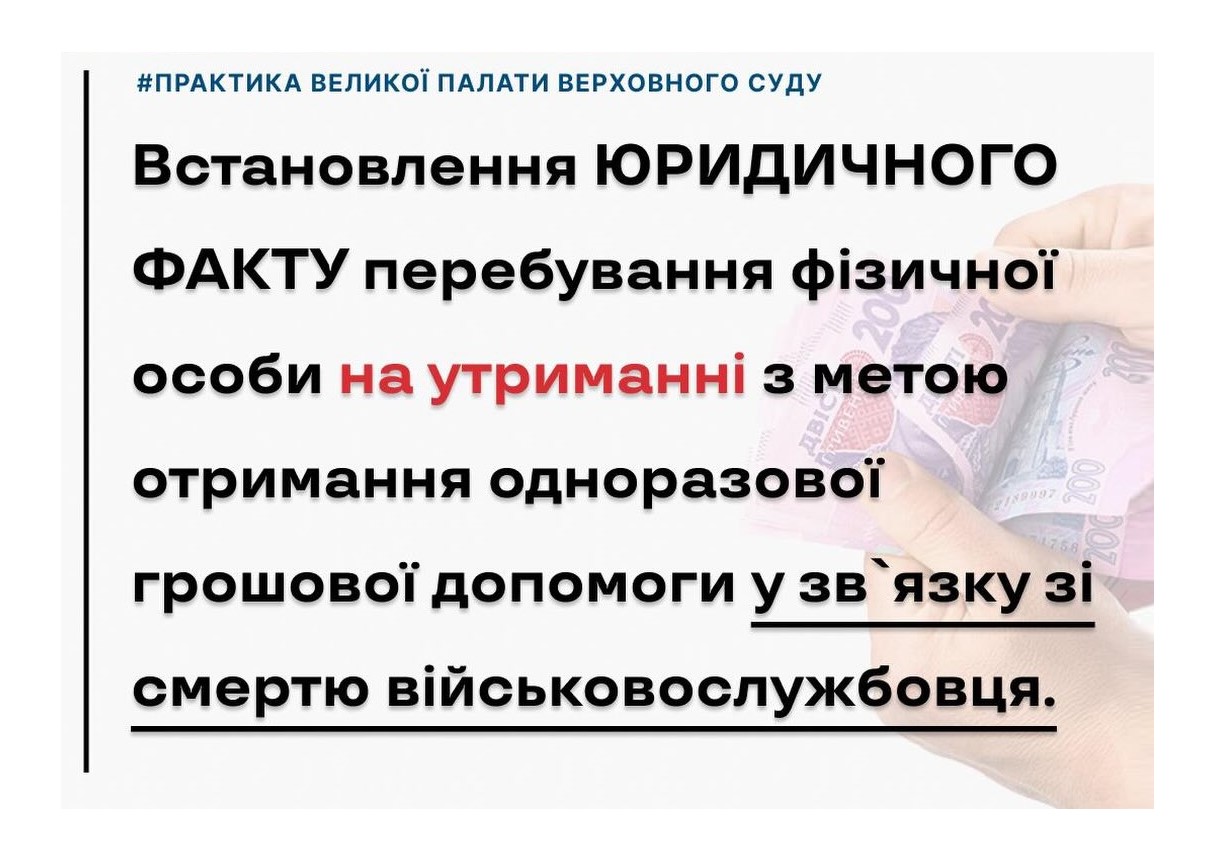 ВПВС в постанові https://reyestr.court.gov.ua/Review/134647902 від 11.02.2026 у справі № 308/17634/23 зробила висновок, що гарантією реалізації права на соціальний захист утриманців загиблих військовослужбовців є судовий порядок встановлення юридичного факту перебування фізичної особи на утриманні з метою отримання одноразової грошової допомоги у зв`язку зі смертю військовослужбовця.